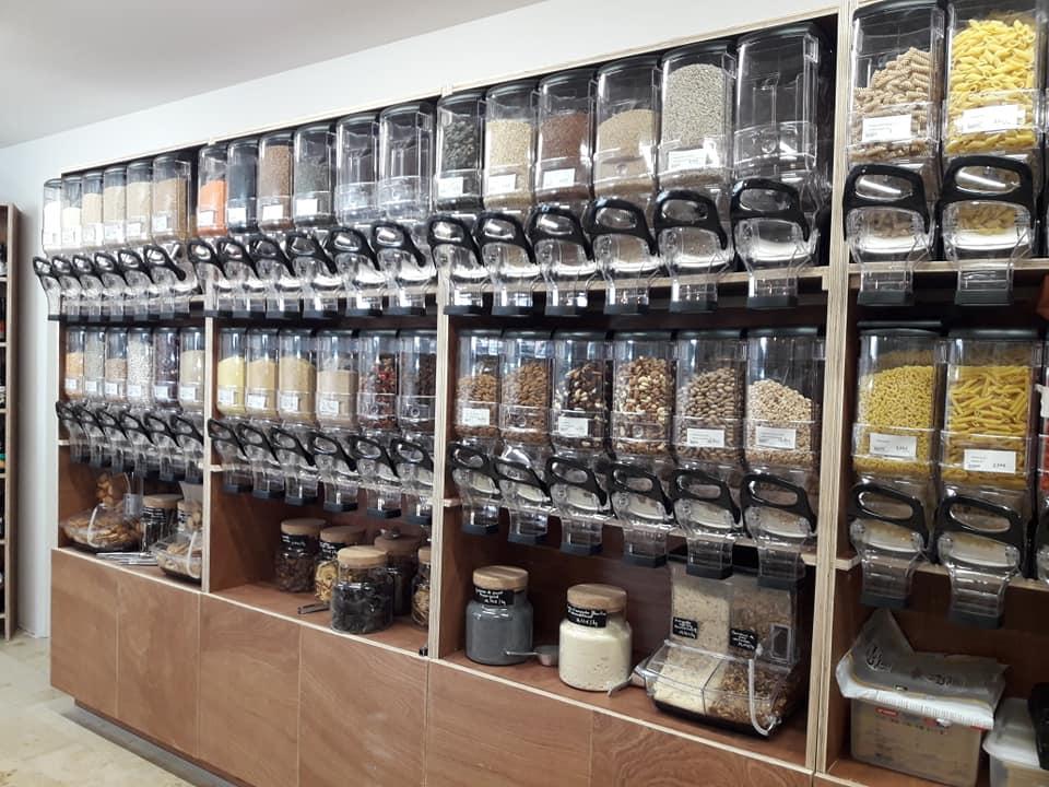 Des produits vendus en vrac : lentilles, quinoa, pâtes, granolas, muesli, avoine, thé, café, noix, biscuits, épices, chocolats, confiseries, farines, graines, huiles, …
