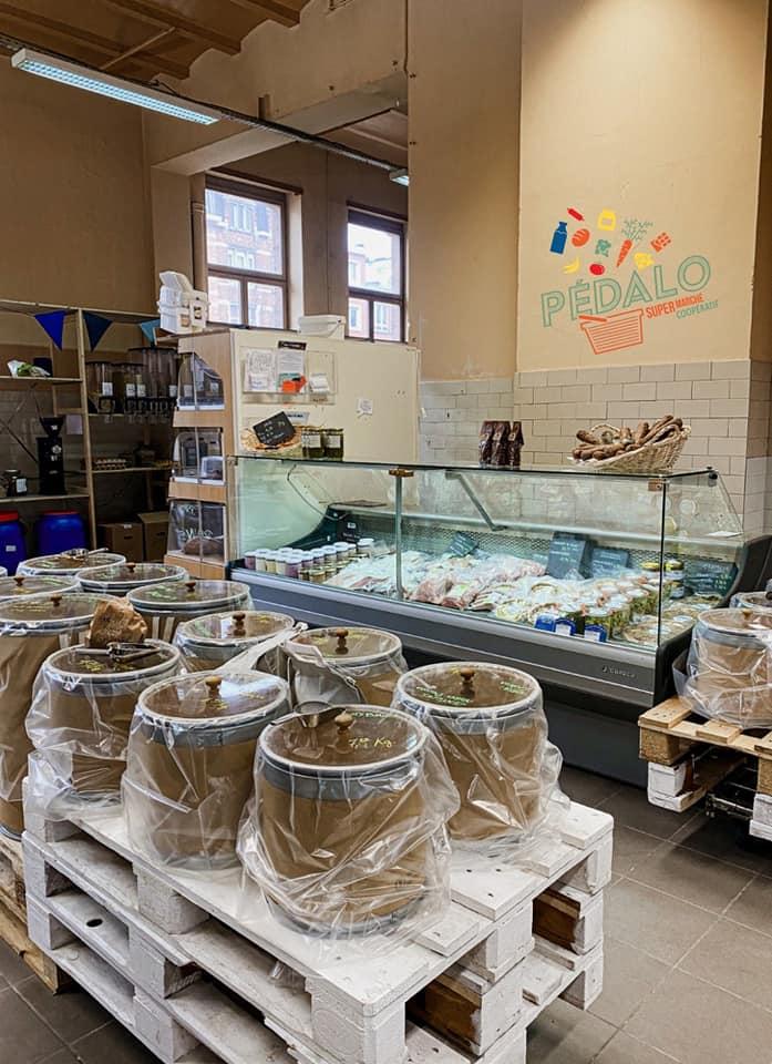 Le Pédalo wil kwaliteitsvoeding toegankelijker maken voor iedereen. We zijn ook solidair met producenten door hen een eerlijke prijs te garanderen en bij voorkeur producten te verkopen van eerlijke handel, kleine producenten, coöperaties enzovoort. De supermarkt is ook een plek waar mensen kunnen samenkomen en praten: we organiseren regelmatig workshops, conferenties en filmdebatten over thema's die voor ons belangrijk zijn (duurzame voeding, anti-afval, zero waste, enz.) om een gezellige sfeer te creëren binnen onze gemeenschap van coöperanten.