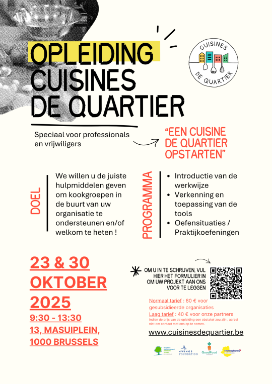 Opgelet : deze scholing in twee halve dagen is bestemd voor werknemers die in hun structuur of buurt een Cuisines de Quartier willen herbergen en begeleiden. (bijv: doktershuizen, buurthuizen, OCMW’s, woon-en werk stichtingen, woongemeenschappen,...) De zelfstandige groepen (zonder begeleiding vanuit een organisatie zoals hierboven beschreven), worden door Cuisines de Quartier opgevolgd.
